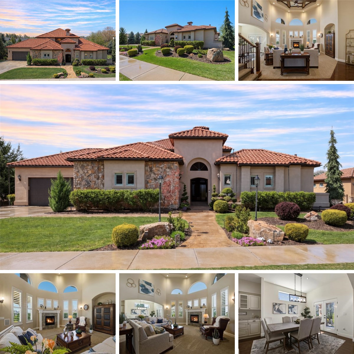 Inside, a grand entry sets the tone with soaring 19-foot ceilings that extend into the main living room and office, creating a dramatic yet inviting, light-filled space. The main level is thoughtfully designed with a primary suite, private office, formal dining room, and spacious living areas that flow seamlessly into the kitchen and casual dining space. Expansive windows throughout bring in natural light and enhance the home’s open, airy feel.