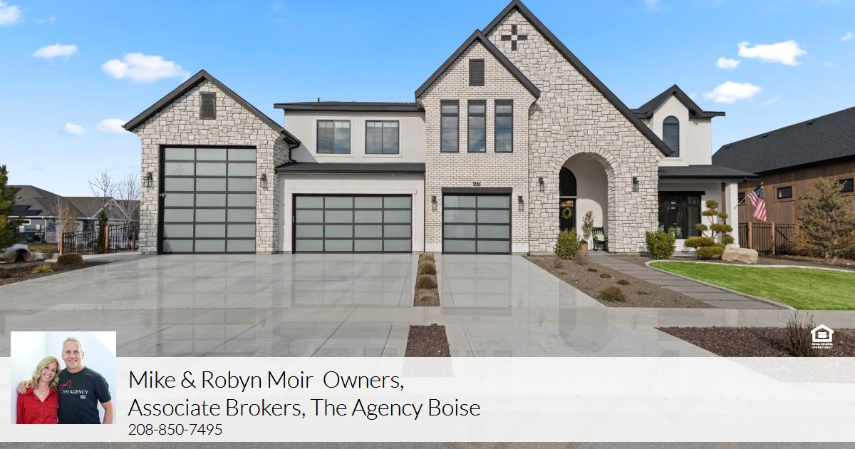 The largest waterfront estate in Legacy — a 7,600 sf home built for lifestyle, entertainment and effortless living. Five ensuite bedrooms, two main-level offices, two expansive bonus rooms, dedicated gym and theater. Enter a grand foyer featuring backlit Vetrite gemstone wall art, soaring ceilings, oversized windows and exceptional craftsmanship throughout. A chef’s kitchen designed for intimate meals or large gatherings: massive quartz island with waterfall edge, connected prep island, dual pantries (including a true butler’s pantry) and a full Thermador appliance package. Warm, inviting touches include engineered hardwood, exposed wood beams and a large double-sided fireplace. Private main-level primary suite with a spa-like bath; upstairs four oversized bedrooms each with en-suite baths. Generous bonus rooms offer flexible use. Two large patios (one per level) capture waterfront and Boise-front views. Rear patio with fire pit and beach access for fishing, paddle boarding or relaxing by the water. Garage accommodates all toys, including a 45 ft deep by 14 ft tall RV bay.