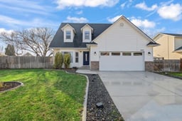 Welcome home to a truly special two-story farmhouse with mountain views, no HOA, and a rare park setting! Built as the original builder’s personal residence, this home offers character and thoughtful design throughout. The backyard backs directly to a city park with a private gate to a paved walking path, just steps from McDonagh Park, the community playground, and Centennial Golf Course. Enjoy a spacious yard with mature trees, irrigation water, two patios, a brick fireplace, and a charming chicken coop & shed. A standout feature is the 90-ft paved RV parking pad with double gates, side parking access, and a 50-amp outlet in the garage. Inside, natural light fills the home with hardwood floors, a cozy living room, and a kitchen featuring granite countertops. A built-in desk & shelving under the staircase includes a custom pet condo. Main-level primary suite with ensuite bath plus three additional bedrooms upstairs. Updates include roof 2021, water heater 2020, dishwasher 2024, HVAC motor replaced. Fridge, washer, and dryer included. Convenient access to I-84, shopping, dining, and Ford Idaho Center!